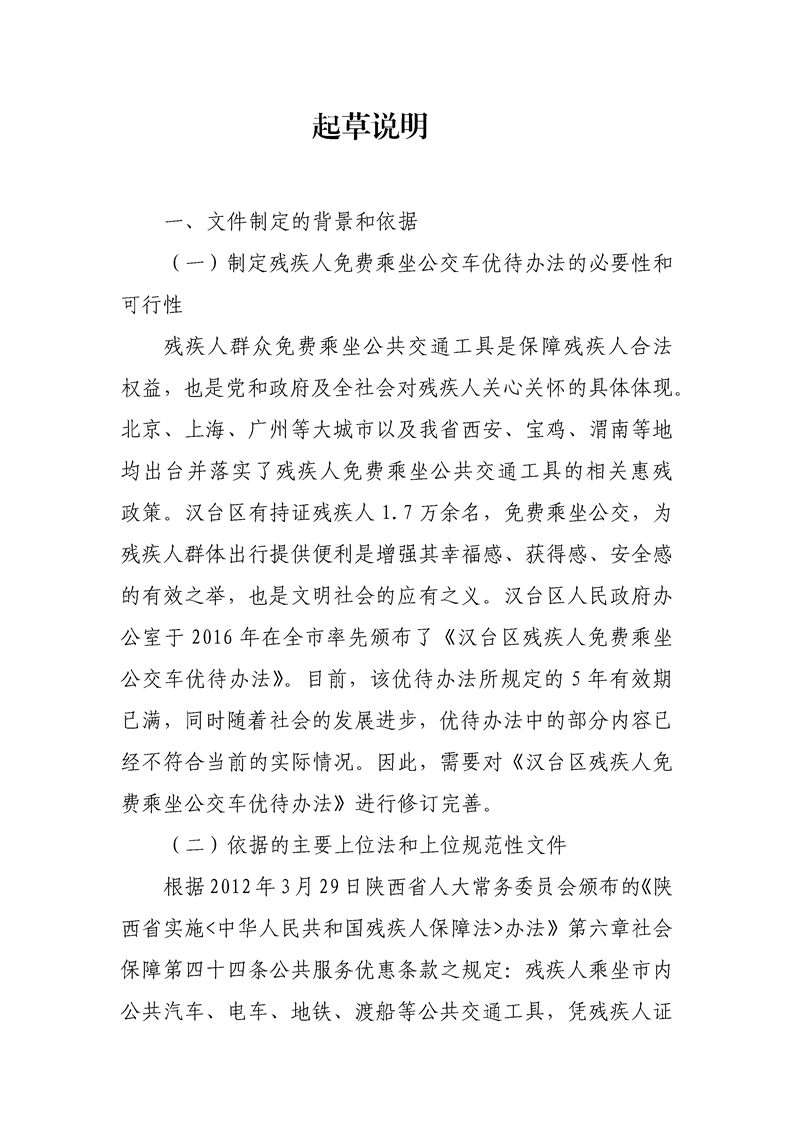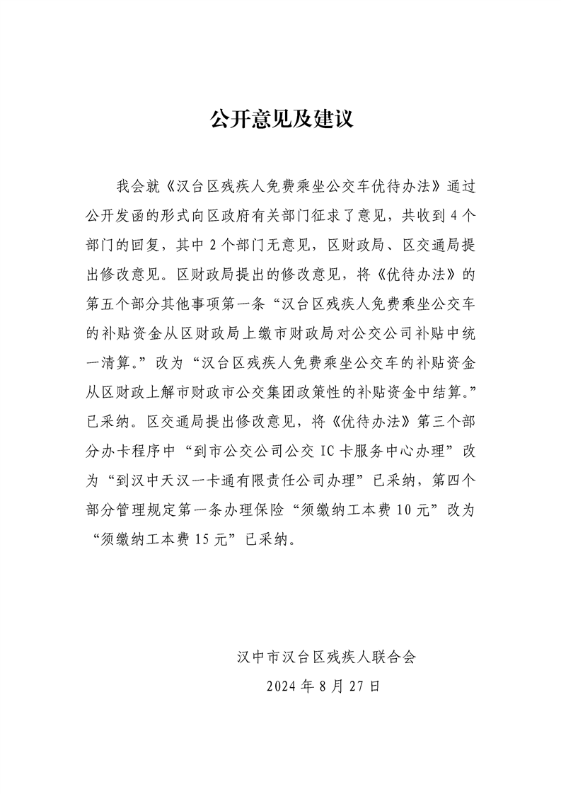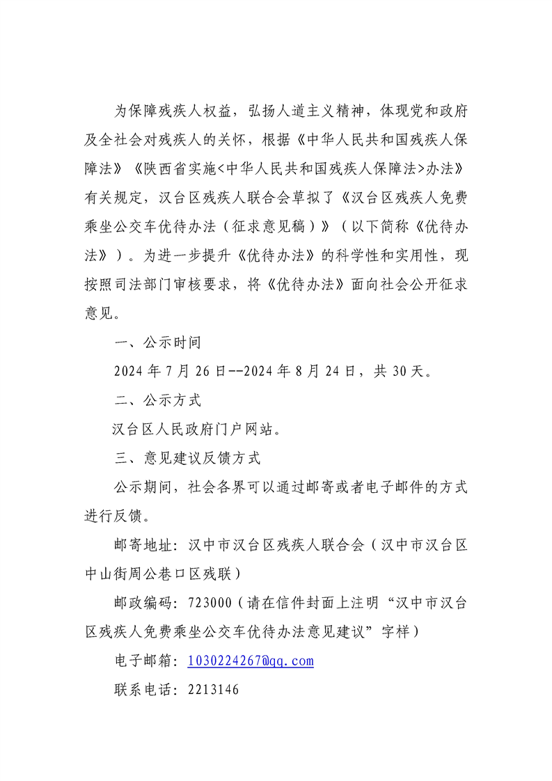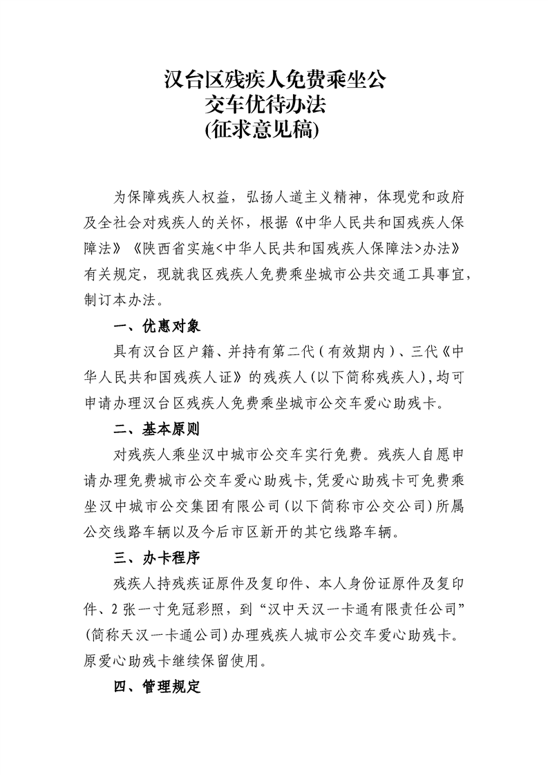 汉中市汉台区残疾人联合会关于征求《汉台区残疾人免费乘坐公交车优待办法(征求意见稿)》意见建议的公告