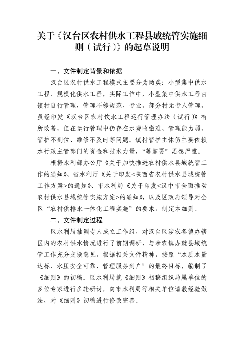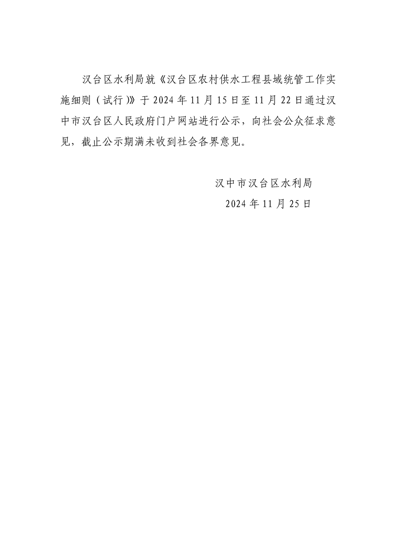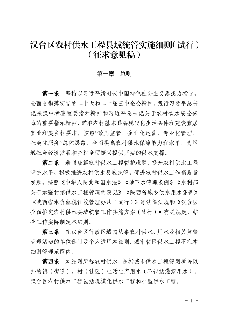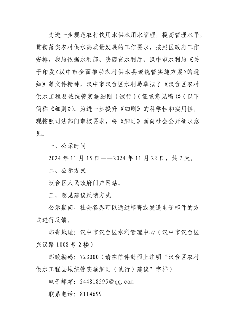 汉中市汉台区水利局关于征求汉台区农村供水工程县域统管实施细则(试行)(征求意见稿)意见建议的公告