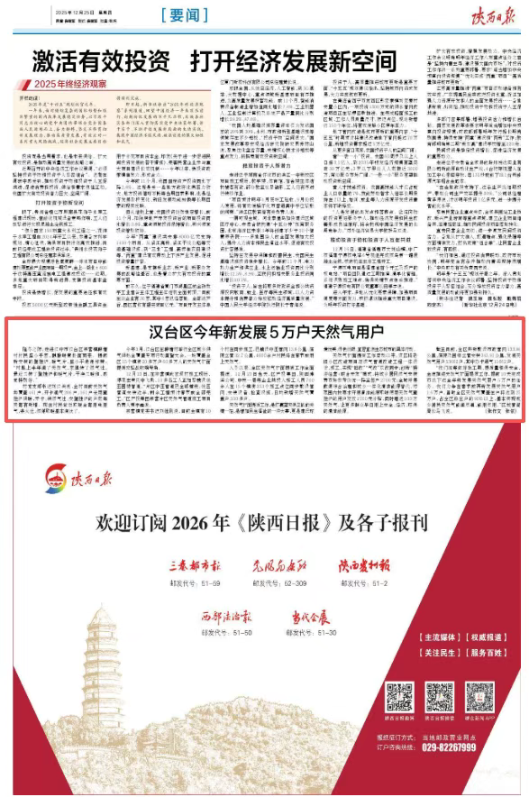 12月25日《陕西日报》要闻版刊发《汉台区今年新发展5万户天然气用户》
