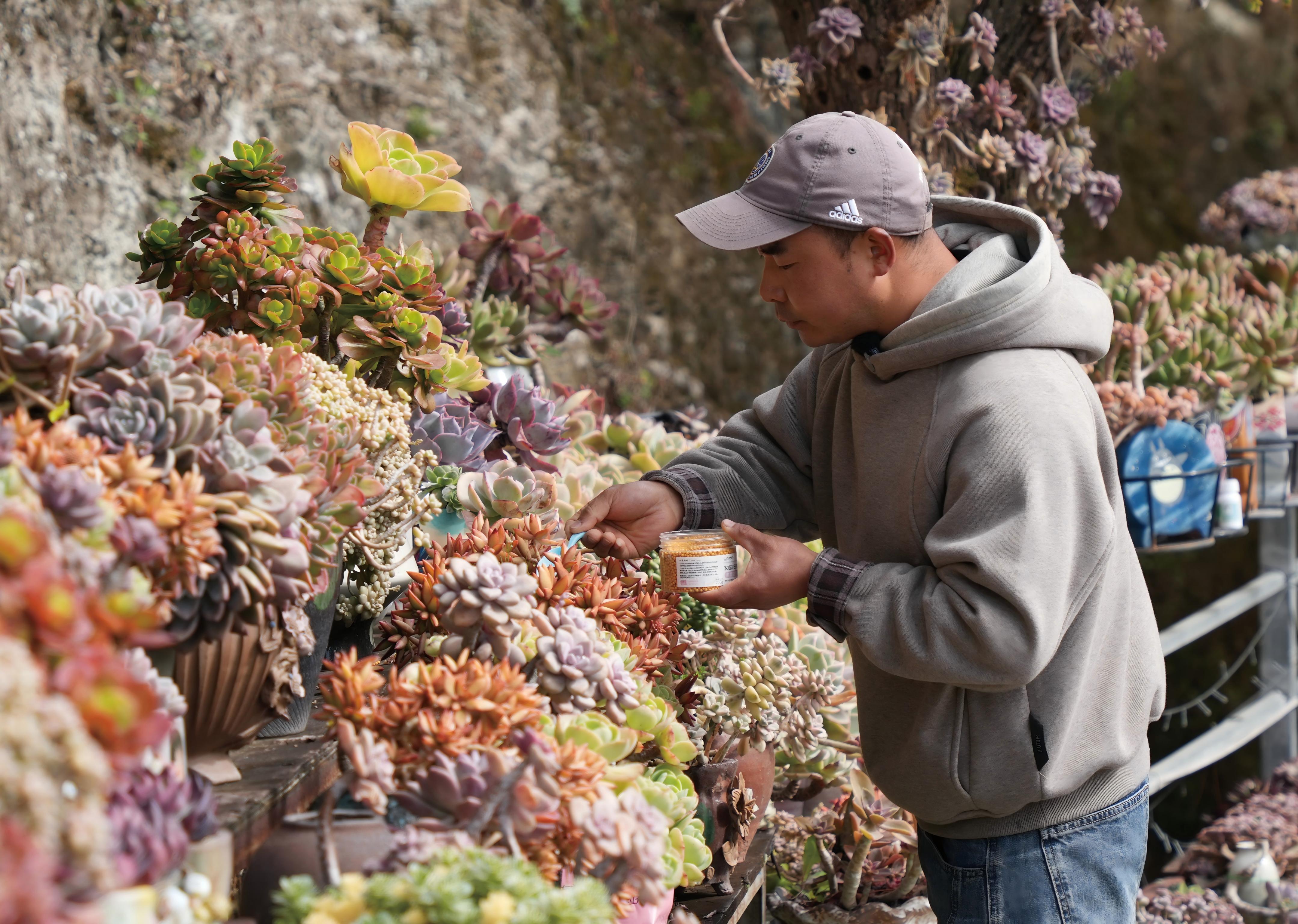 李坤为多肉植物施肥。 记者 朱媛媛 摄
