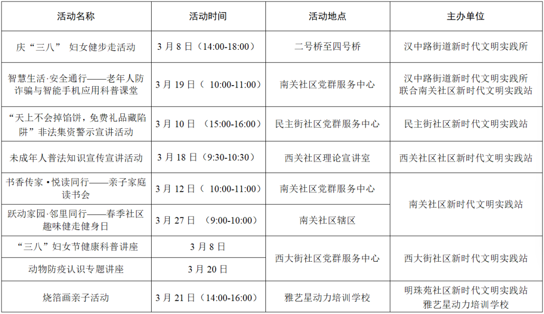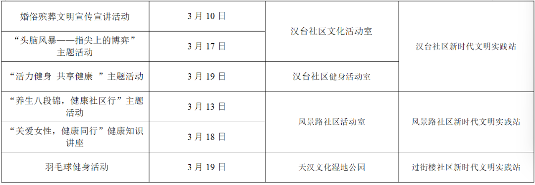 三月,汉台区新时代文明实践中心(所、站)将围绕学习实践科学理论、宣传宣讲党的政策、培育践行主流价值、丰富活跃文化生活、持续深入移风易俗、城市文明建设六大任务开展丰富多彩的文明实践活动,期待您的参与!