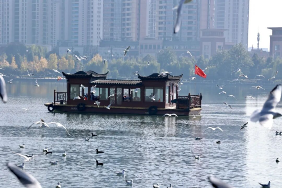 冬日暖阳下的汉江波光粼粼,在位于汉中市中心城区的天汉湿地公园,上千只羽翼洁白的红嘴鸥在江面盘旋、嬉戏,灵动的身影为冬日里的汉江再添生机,江边“人鸥同框”的画面成为动人的风景。
