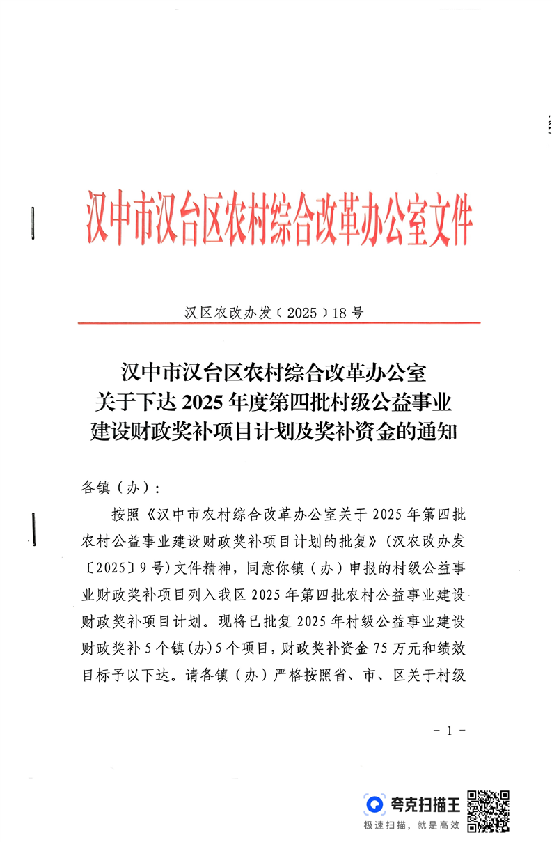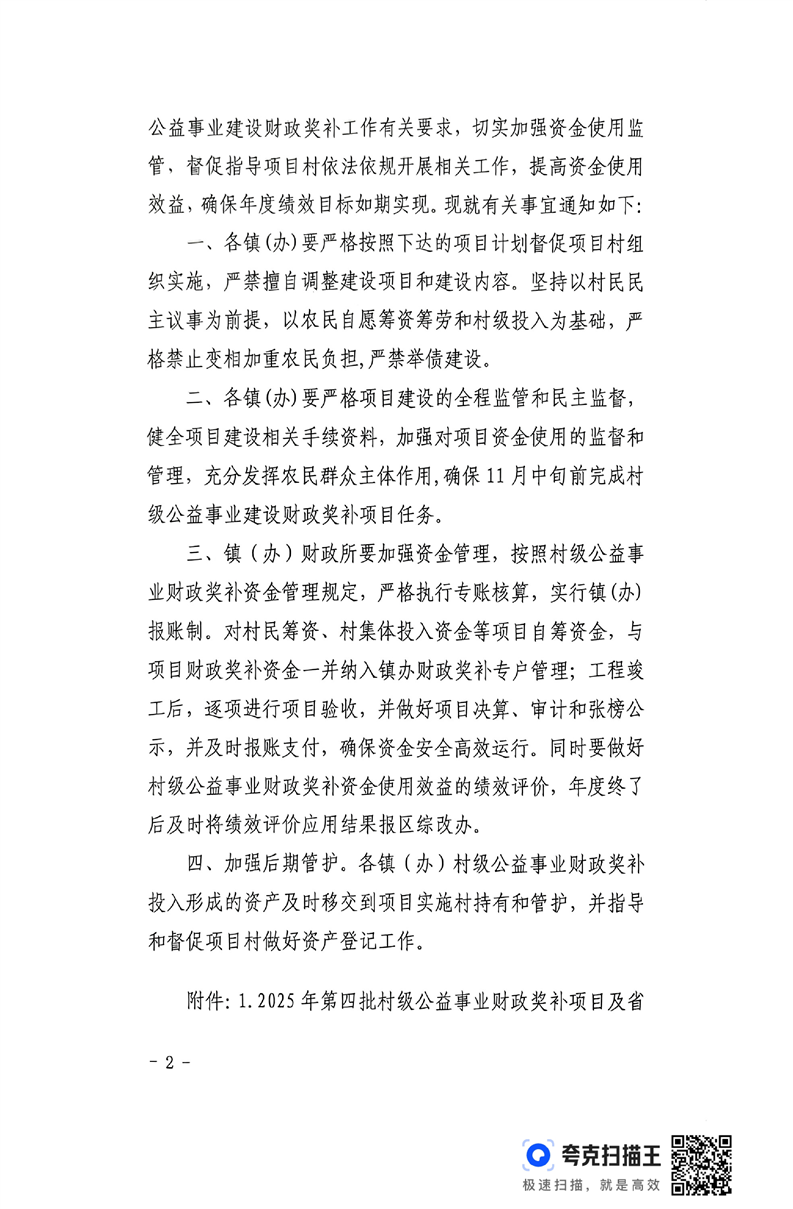 关于下达2025第四批村级公益事业建设财政奖补项目计划及奖补资金的通知