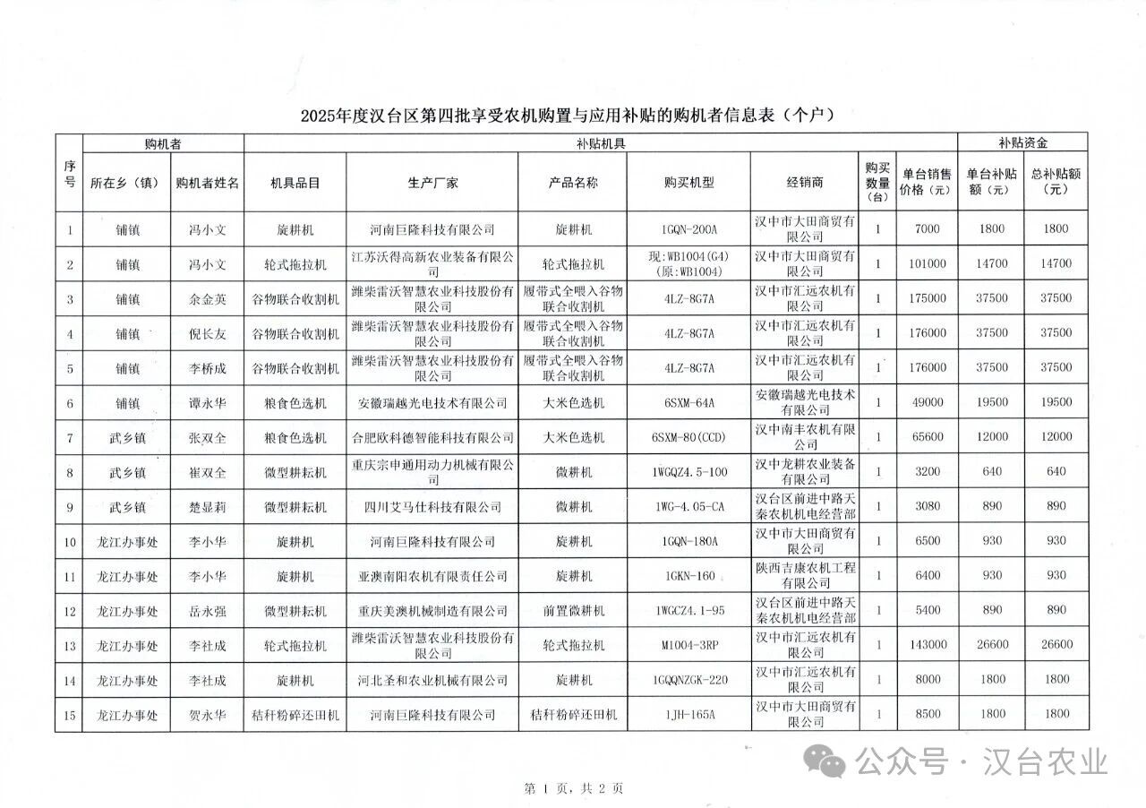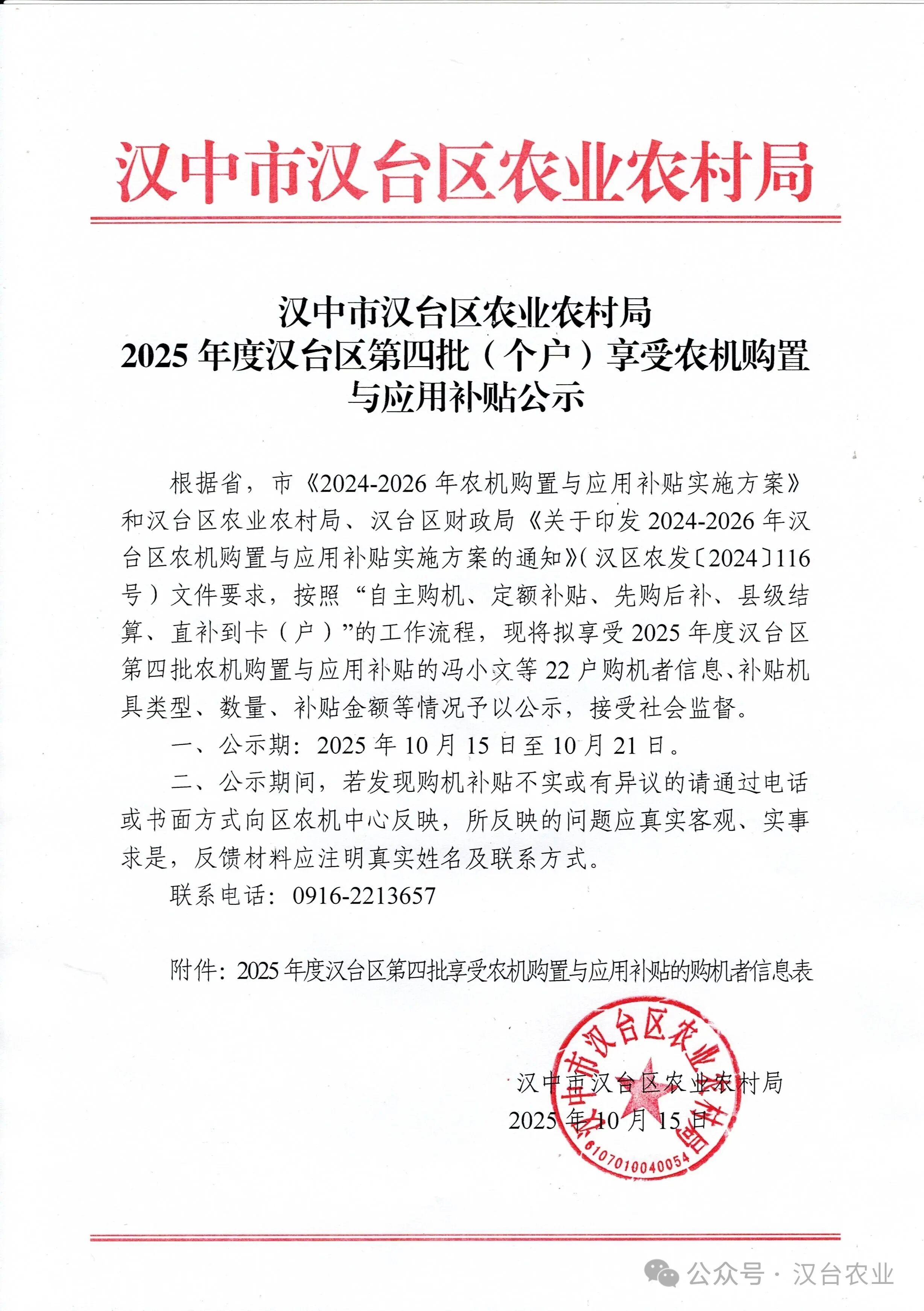 汉中市汉台区农业农村局2025 年度汉台区第四批(个户)享受农机购置与应用补贴公示