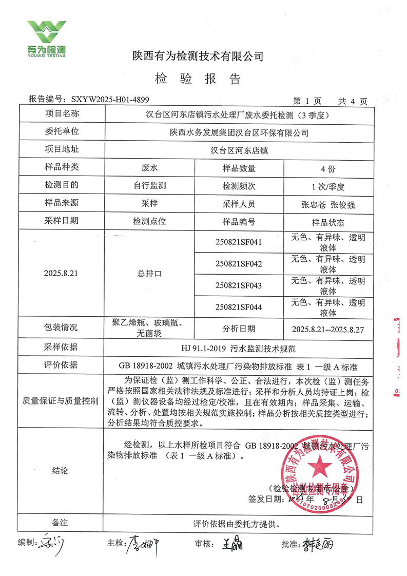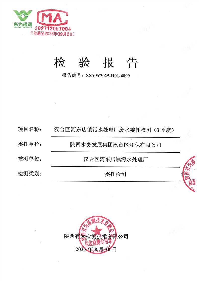 汉台区2025年第三季度武乡、河东店镇污水处理厂废水检测报告