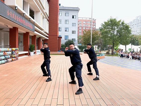 活动中,巡特警大队以整齐步伐入场,通过装备展示(单警装备、警用枪械、盾牌等)、军体拳表演、警犬与车辆模拟搜毒等环节,以幼儿喜闻乐见的形式普及安全知识,激发幼儿对警务工作的敬意。