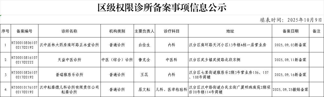 按照《国家卫生健康委和国家中医药局印发关于诊所备案管理暂行办法的通知》(国卫医政发〔2022〕33号)及《汉中市汉台区人民政府办公室关于建立行政审批与监管协调联动工作机制的通知》(汉区政办函〔2018〕84号)要求,现向社会公开区级权限诊所备案信息(附件),如有问题,请向区卫生健康局或区行政审批服务局反映。在反映问题时,请提供具体事实、线索和联系方式,以便我们调查核实并将情况作反馈。