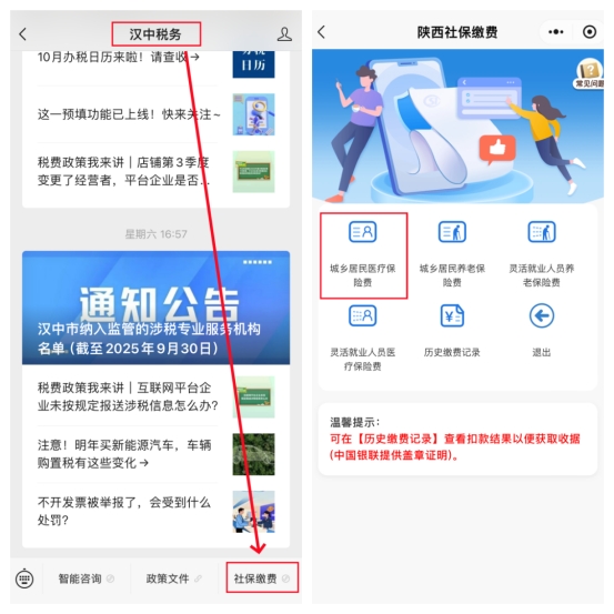 【“陕西税务”和“汉中税务”微信公众号线上缴费方式】:
