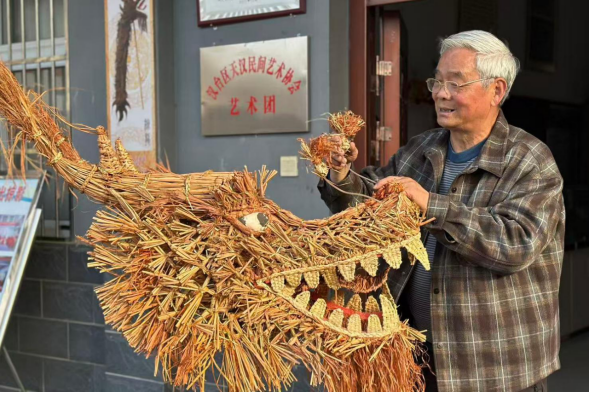 为挖掘技艺,他揣着笔记本挨家挨户寻访老艺人,将“龙身节数必为单数”“舞时讲究心齐劲匀”等口诀一一记下;草龙制作的门道,更是被他摸得透彻。“选料得是当年新收的上乘稻谷草”“晾干后扎成小把在盐水里蒸煮,既杀虫蛹,还耐用”……从选材到编织,每个环节他都亲力亲为,带领村民制作草龙、板凳龙等道具上千件,件件都凝聚着他对技艺的敬畏。