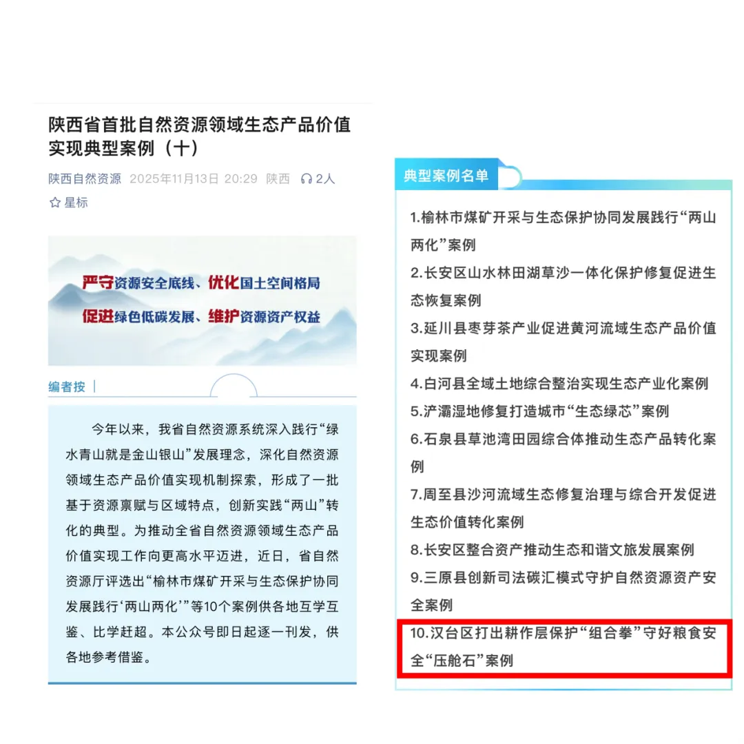 近日,陕西省自然资源厅公布了陕西省自然资源领域生态产品价值实现机制探索典型案例名单。汉中市汉台区报送的《汉台区打出耕作层保护“组合拳”守好粮食安全“压舱石”案例》,经严格评审从众多参评案例中脱颖而出,成功入选。