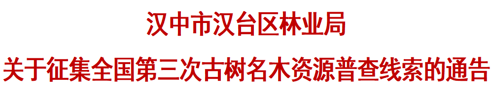 为深入贯彻落实《古树名木保护条例》《全国第三次古树名木资源普查方案》相关要求,进一步加强我区古树名木保护管理工作,全面摸清辖区内古树名木资源底数,建立健全资源档案,现面向社会公开征集汉台区古树名木相关线索。就有关事项通告如下: