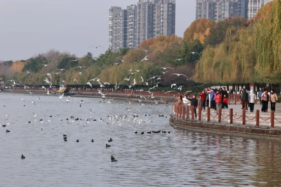 冬日暖阳下的汉江波光粼粼,在位于汉中市中心城区的天汉湿地公园,上千只羽翼洁白的红嘴鸥在江面盘旋、嬉戏,灵动的身影为冬日里的汉江再添生机,江边“人鸥同框”的画面成为动人的风景。