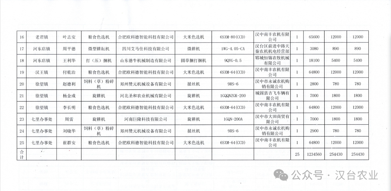 汉中市汉台区农业农村局2025 年度汉台区第四批(个户)享受农机购置与应用补贴公示