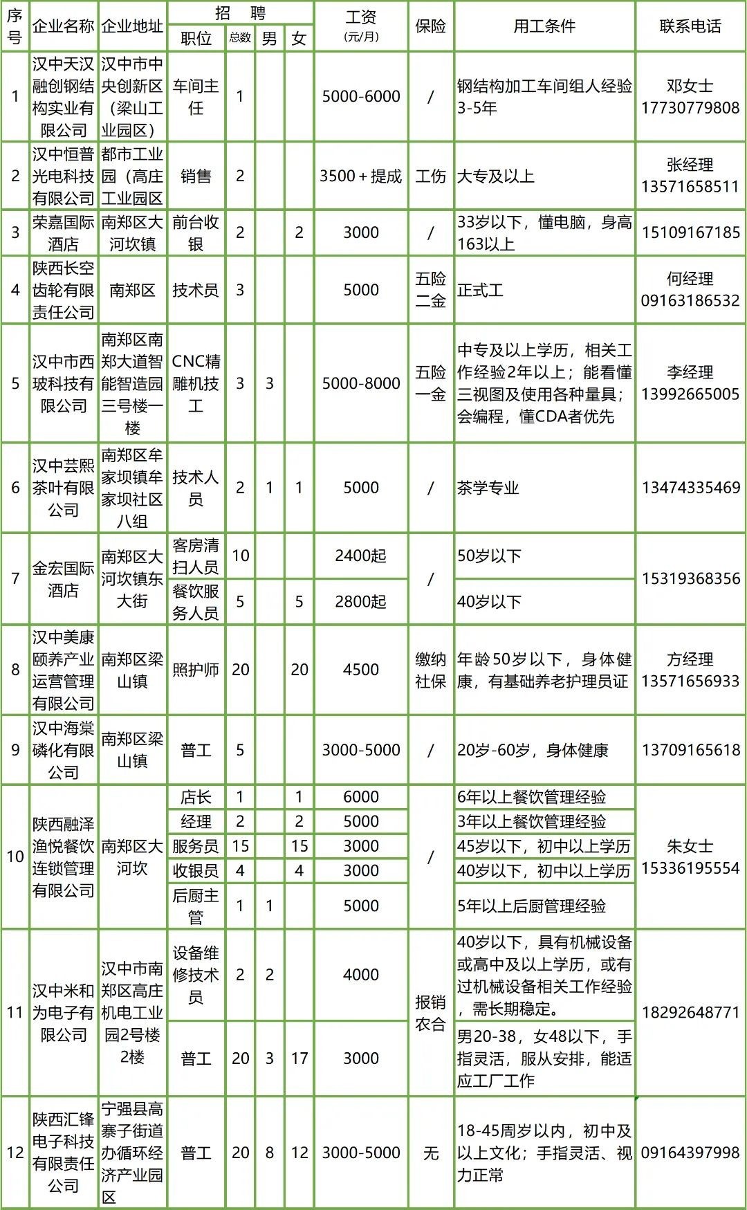 兴业在汉中,乐业在家乡。现发布募集的招聘岗位信息,请劳动者根据自身条件,主动联系企业应聘。锚定高质量充分就业,让群众找到好工作,让企业招到合适的员工,就业部门一直在奋斗,更离不开劳动者和用人单位的双向奔赴。汉中市人力资源中心市场每月10日、26日举办现场招聘会,欢迎劳动者和用人单位现场洽谈对接。咨询电话0916-2706221。