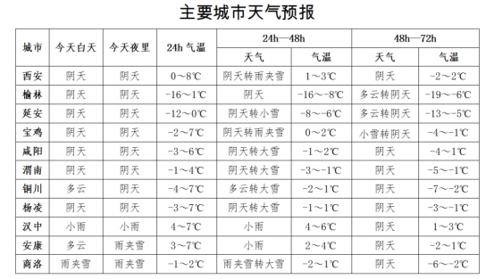 19日:全省阴天,陕北南部有小到中雪(0.1~5毫米)、局地大雪(5~8毫米);关中北部、商洛、秦巴山区雨夹雪转中到大雪(4~10毫米),关中平原、安康平原有小雨或雨夹雪转中到大雪(4~10毫米),其中延安南部局地、关中东部局地、商洛南部局地、秦巴山区局地有暴雪(10~18毫米),汉中平原小雨转雨夹雪或小到中雪(0~7毫米),秦巴山区部分地方有冻雨或冰粒。陕北大部、关中北部、秦巴山区有4级左右偏北风(5.5~7.9米/秒),最大阵风6级(10.8~13.8米/秒)。日平均气温全省大部下降6℃左右,陕北南部局地、关中北部局地、秦巴山区局地下降8~10℃。