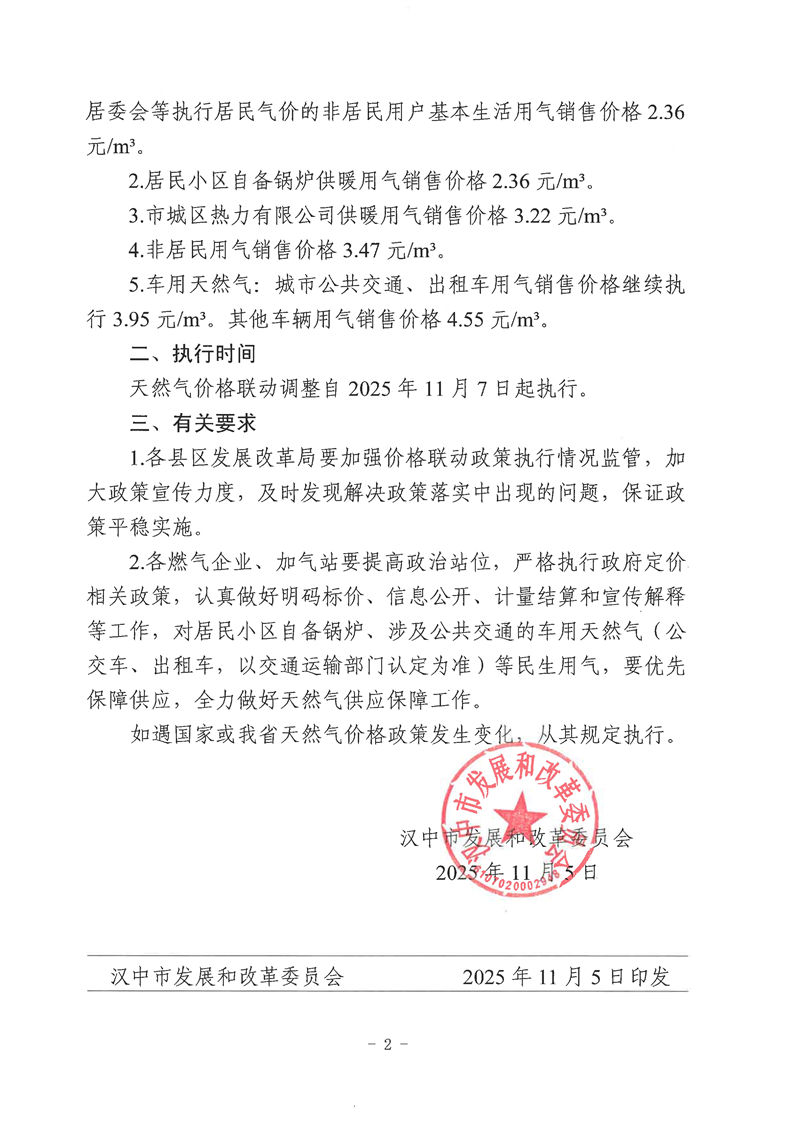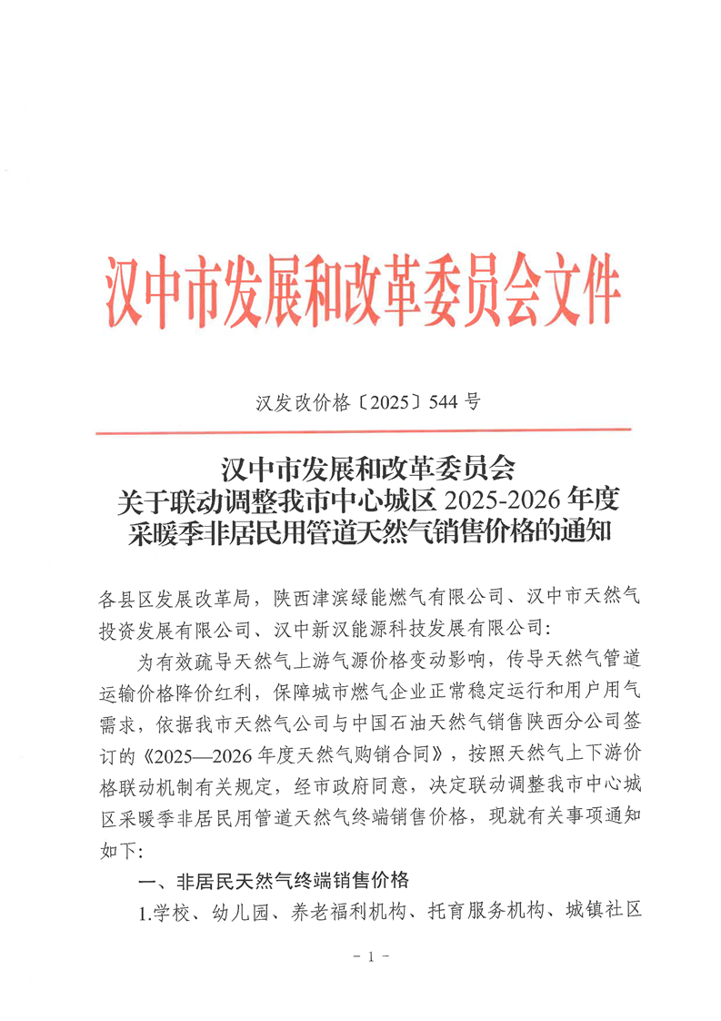 关于联动调整我市中心城区2025-2026年度采暖季非居民用管道天然气销售价格的通知