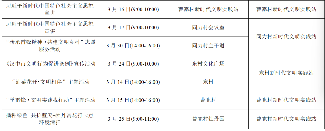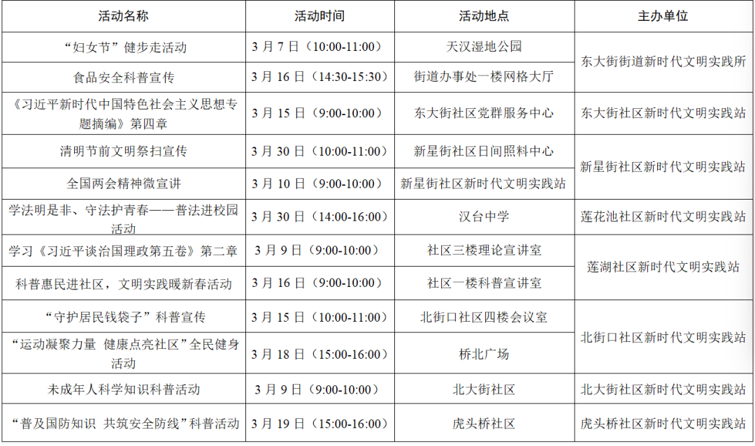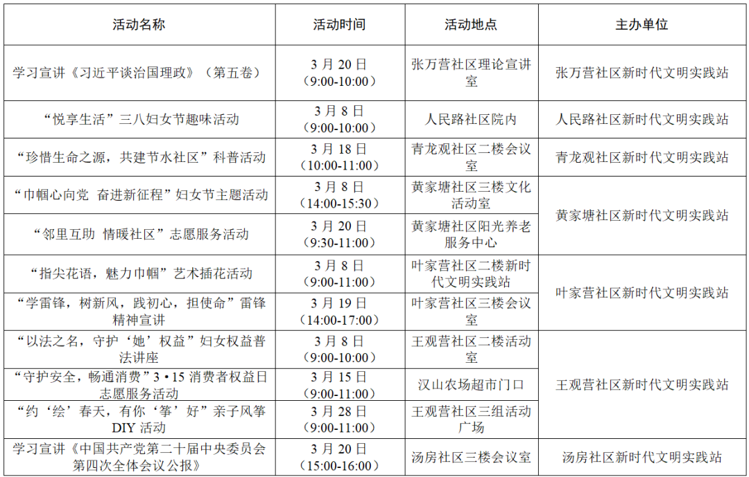 三月,汉台区新时代文明实践中心(所、站)将围绕学习实践科学理论、宣传宣讲党的政策、培育践行主流价值、丰富活跃文化生活、持续深入移风易俗、城市文明建设六大任务开展丰富多彩的文明实践活动,期待您的参与!