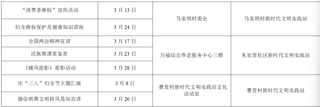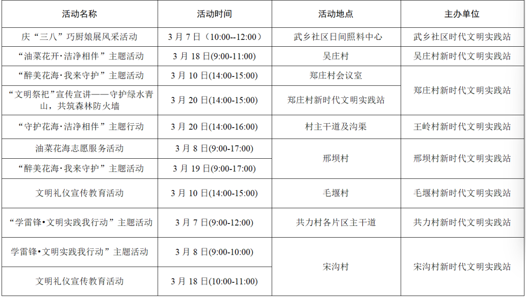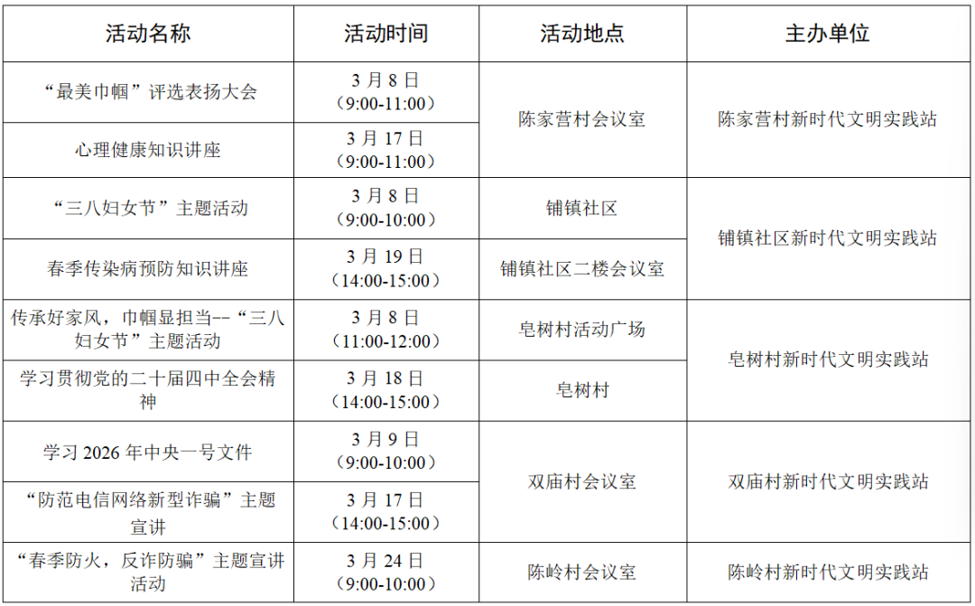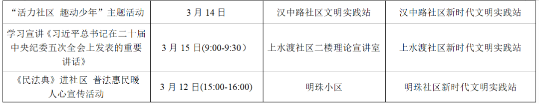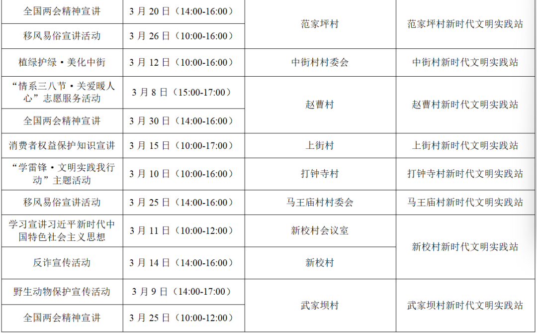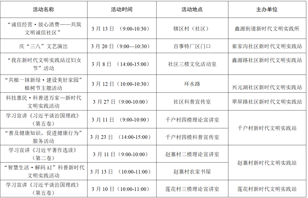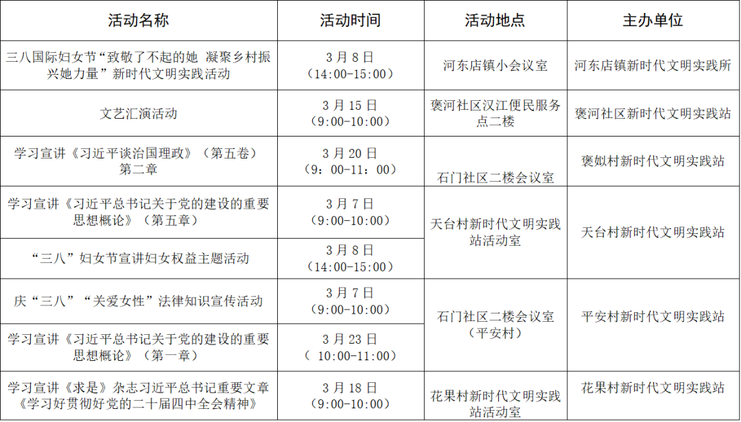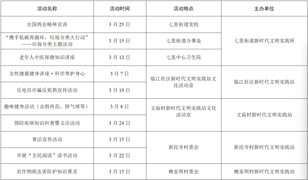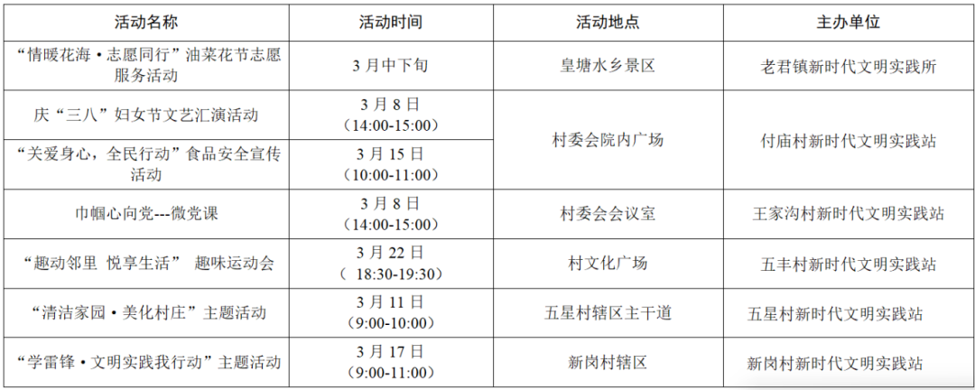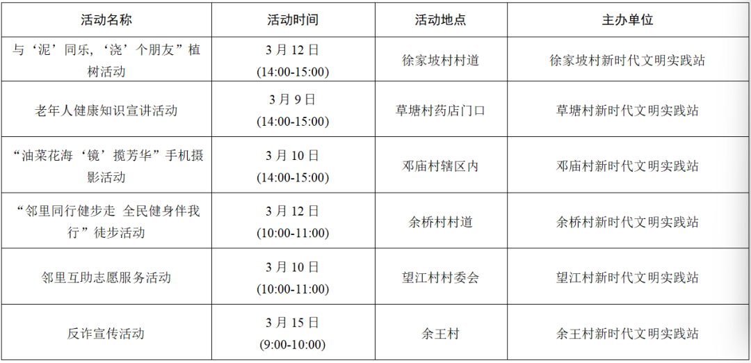以上为部分活动计划,具体活动的开展以实际情况为准。更多活动还可关注各镇(街道)新时代文明实践所、村(社区)新时代文明实践站微信公众号、活动阵地公示的活动展板。身边的新时代文明实践活动,期待您的热情参与,让我们携手共进,争做新时代文明实践的参与者。